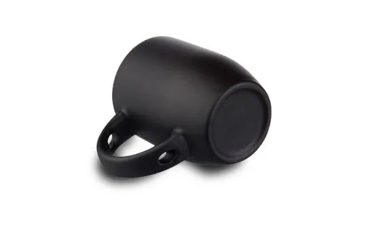 Schwarzer Löffelbecher selbst gestalten und bedrucken. Kaffeebecher mit schwarzer Innenseite mit farblich passenden schwarzen Henkel und Löffel.
