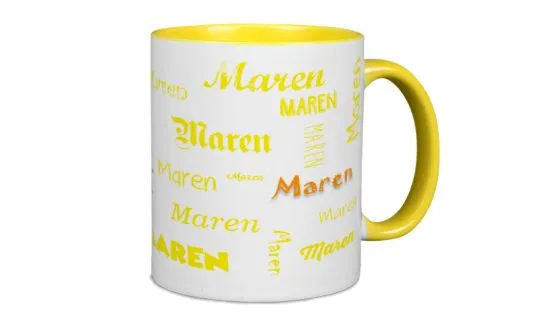 Die Tasse mit gelben Henkel und gelber Innenfläche wird mit Deinem Wunschtext oder Namen in verschiedenen Schriftarten in den Farben gelb und orange bedruckt. Diese rundherum bedruckte Tasse mit deinem Namen fällt überall auf.