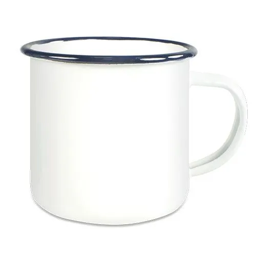 Emaille Becher mit blauen Tassenrand selbst gestalten und bedrucken. Der Emaille Becher ist vielseitig einsetzbar. Ob als Kaffeetasse, Trinkbecher oder als Camping Tasse, dieser Emaille becher ist robust und ist dadurch ideal für den Outdoor- oder Campingurlaub.