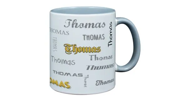 Die Namenstasse wird mit einem Wunschtext oder Namen in verschiedenen Schriftarten in verschiedenen Farben bedruckt. Diese rundherum bedruckte Tasse mit Deinem Namen fällt überall auf.